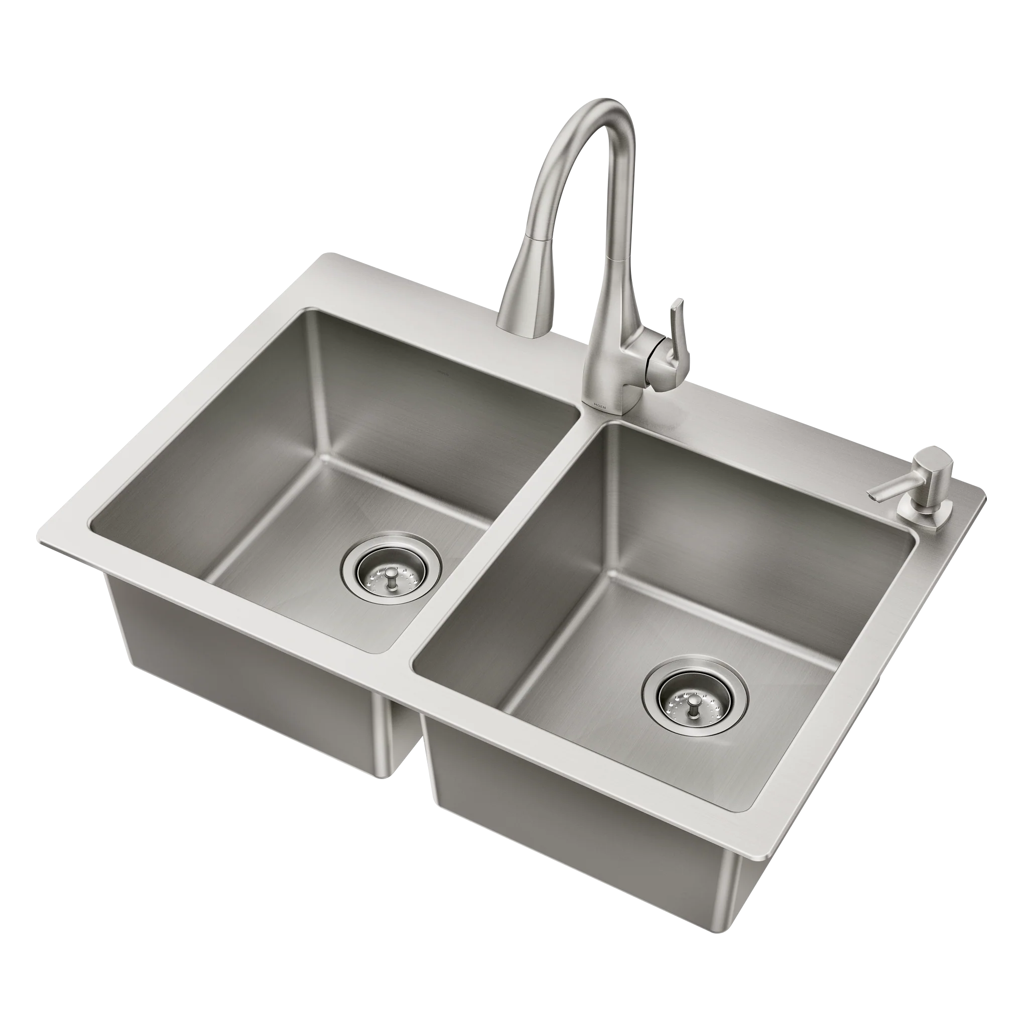 Melding striking style with helpful functionality, the Kiran™ faucet and sink combination is a beautiful, easy-to-install addition to the kitchen. It includes a transitional pulldown kitchen faucet with a unique square-shaped base and sculpted handle, 18-gauge rounded double bowl stainless steel sink, sink drains, and matching soap dispenser. The faucet features Moen’s Power Clean™ technology, which cleans 50 percent faster than Moen faucets without the technology, as well as the Reflex® system to ensure smooth operation and secure docking of the spray wand. The faucet’s Spot Resist™ Stainless finish provides a cleaner looking appearance, while SoundSHIELD™ technology on the sink reduces noise. This faucet and sink combination features a sleek design that will seamlessly accent an array of kitchen designs.